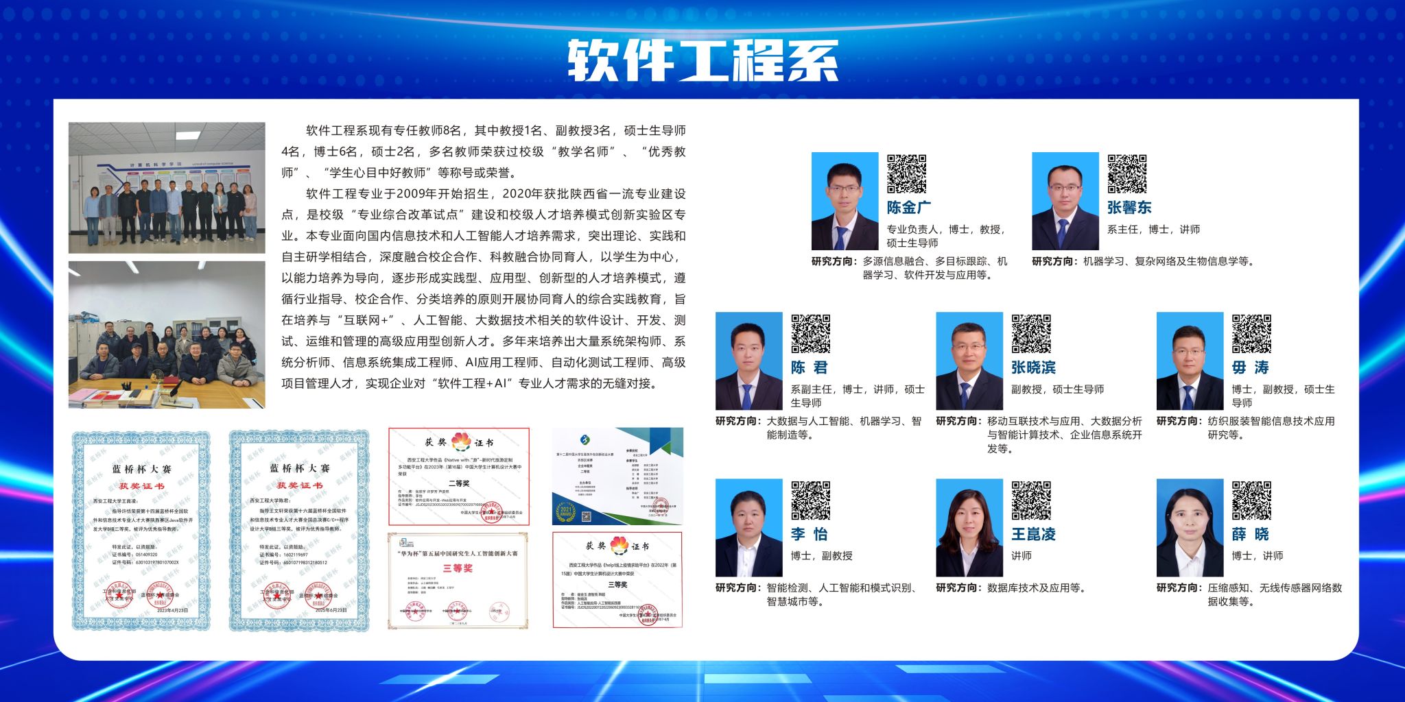 专业特色:本专业为学院主设专业之一,2009年开始独立招生,2020年获批陕西省一流专业。本专业面向国内信息技术人才需求,突出理论、实践和自主研学相结合,逐步形成实践型、应用型、创新型的人才培养模式,实现企业对软件工程专业人才需求的无缝对接。