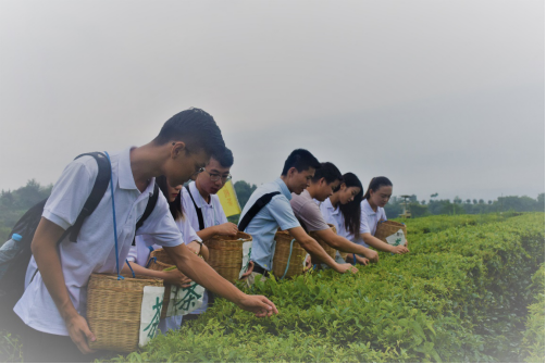 在经过工作人员简单的采茶技巧培训后,大家每人背着一个小茶叶篓有序走向了位于半山腰的茶园。雨后的茶园空气格外清新、满眼的绿色沁人心脾。俯下身子,与茶叶来个零距离接触,指尖拿捏,采下一片片新发的嫩芽。因为采茶对于茶叶的部位要求很高,或是一芽一叶、或是一芽两叶,茶的体积极小,要想采出标准化的茶叶对我们这些新手也是极有难度的。实践团采了近一个小时,集中了大家20多人的劳动成果,采出的茶才勉强铺平茶叶篓的篓底,大家也从中体味到了采茶之不易。