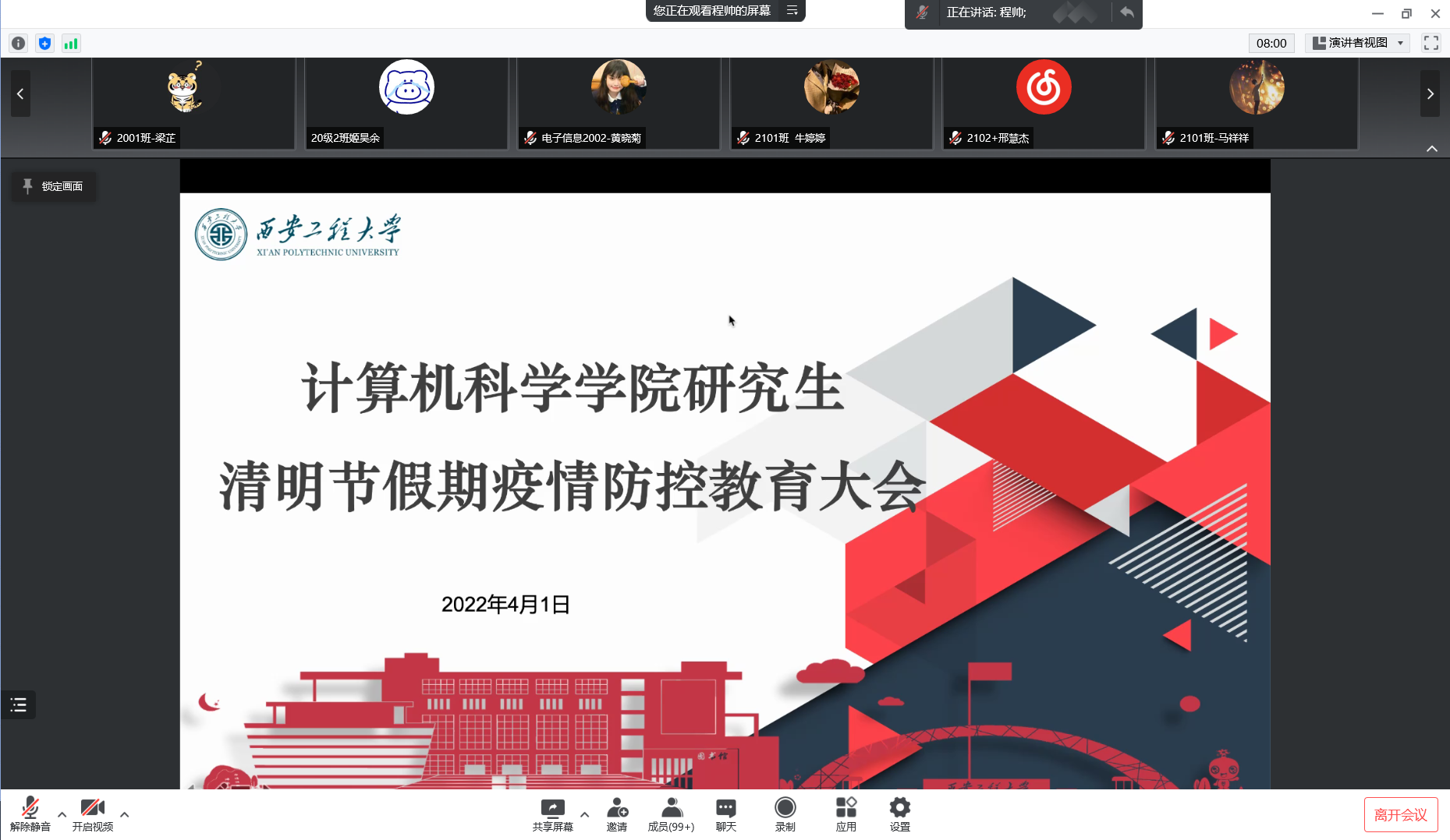 为进一步让学生了解当前疫情防控的严峻形势,提高我院研究生的疫情防范意识,避免新冠疫情校园传播风险,4月1日18点,beat365在线唯一官网在线上召开研究生清明节假期疫情防控教育大会。会议由研究生辅导员程帅主持,全体研究生参加了此次会议。