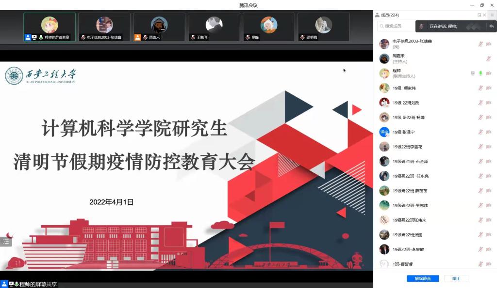 随后,各位辅导员也及时行动,组织召开线上线下会议,传达学校清明节放假及外出的相关要求。各年级各班也通过召开主题班会的形式将清明节假期的疫情防控政策和外出须知传达到每一位同学,确保大家知规矩、守规矩,安全平稳度过清明节假期。(撰稿:张鑫 审核:周波)