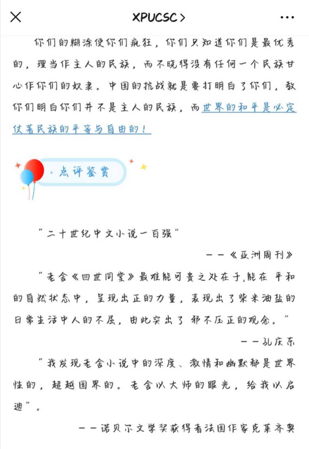 歌德曾经说过“读一本好书,就是和一位品德高尚的人谈话。”读书,不仅开阔人们的视野,丰富大家的知识储备,而且能够陶冶自我情操,让人受益终生。此次活动充分展现了阅读的乐趣与魅力,唤起了同学们读书学习的热情,对于养成良好的阅读习惯、塑造勤于思考的品质,丰富疫情期间的精神生活多有裨益。(撰稿:朱成功 审核:王雅慧)