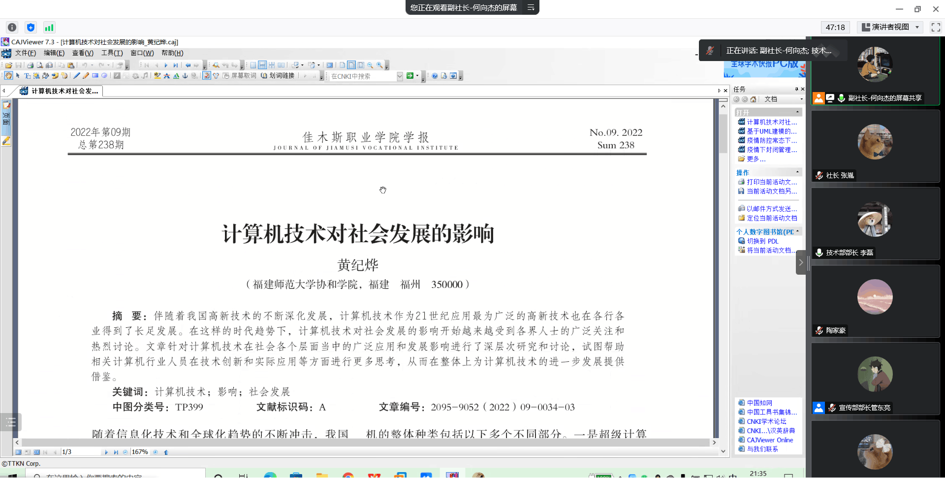 通过前一段时间的社团招新工作,西安工程大学beat365在线唯一官网计算机协会完成了新学年的招新活动。结合当下疫情现状和社员们的学习需求,协会于2022年11月23日在线上举办了“新生社员交流暨知网知识介绍会”。