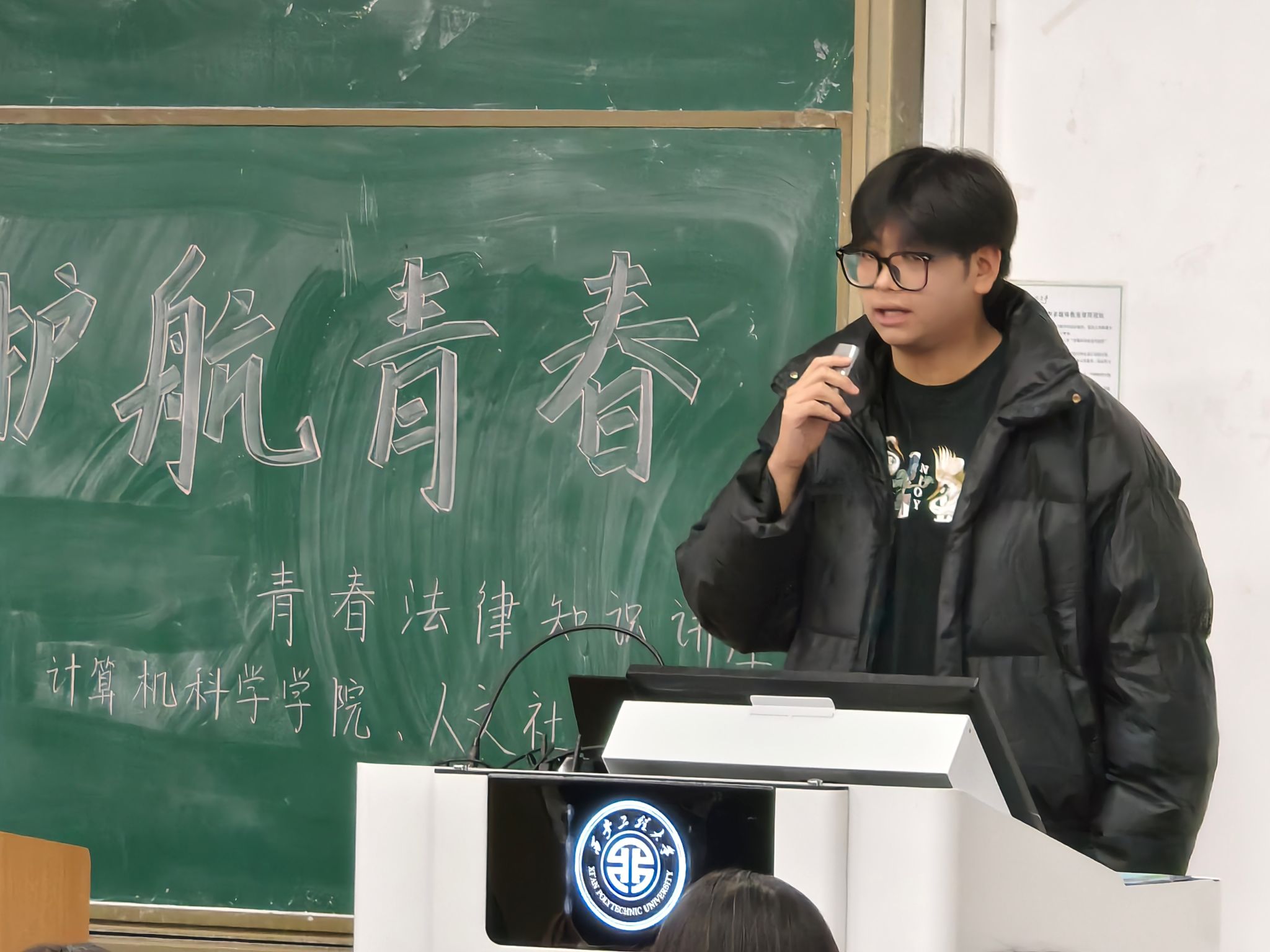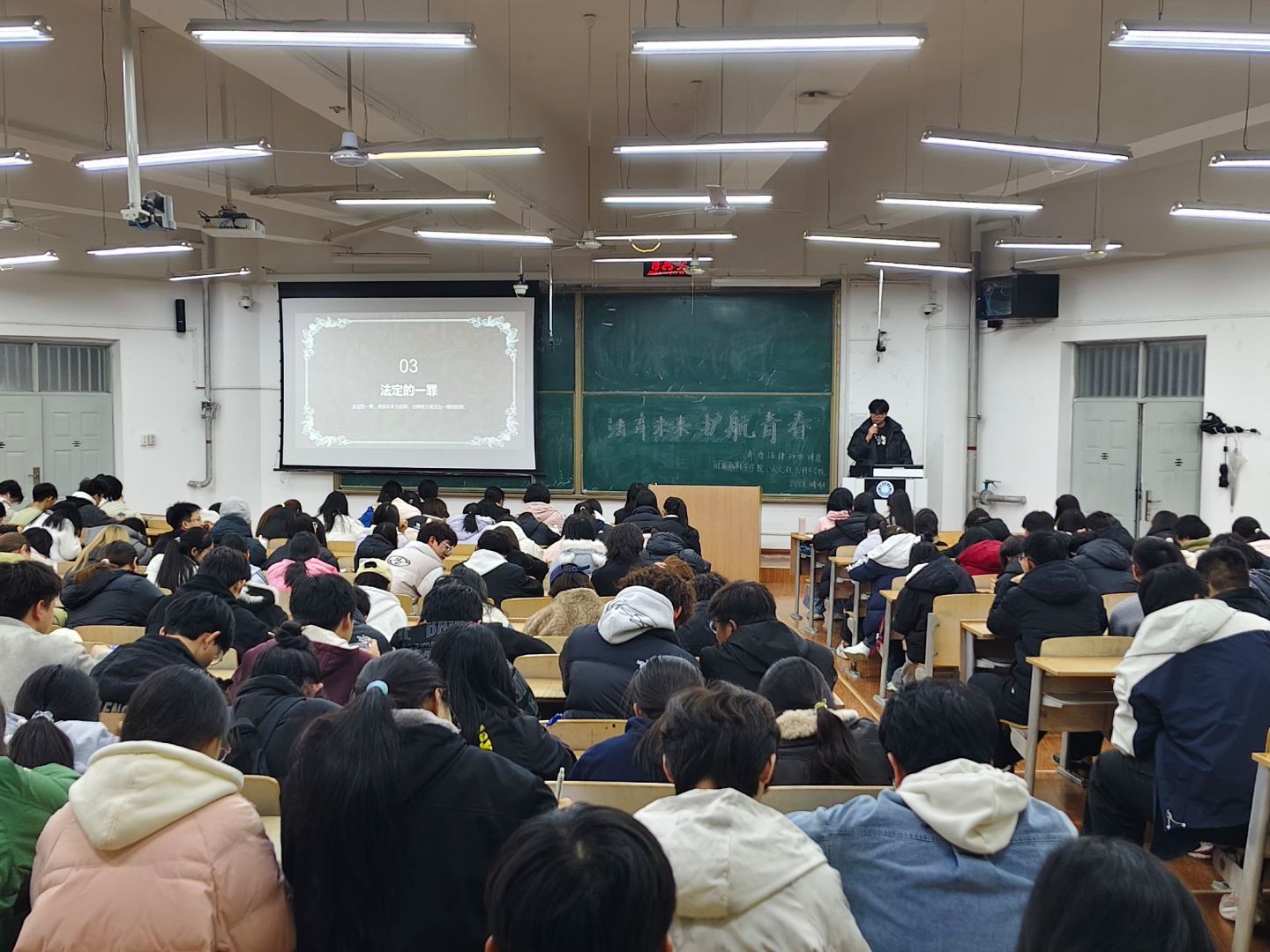 为深入推进法治校园建设,精准普及刑法核心知识,帮助计算机专业学子以专业思维理解法律责任边界,11月24日,beat365在线唯一官网联合人文社会科学学院在B-133教室开展“青春释法共筑法治校园”系列普法活动。本场活动第二讲以“罪数形态——代码逻辑理清‘责任嵌套’”为核心主题,特邀人文社会科学学院24级法学1班于铭豪、韩幸迪两位同学担任主讲人,两院260余名学子到场参与学习。