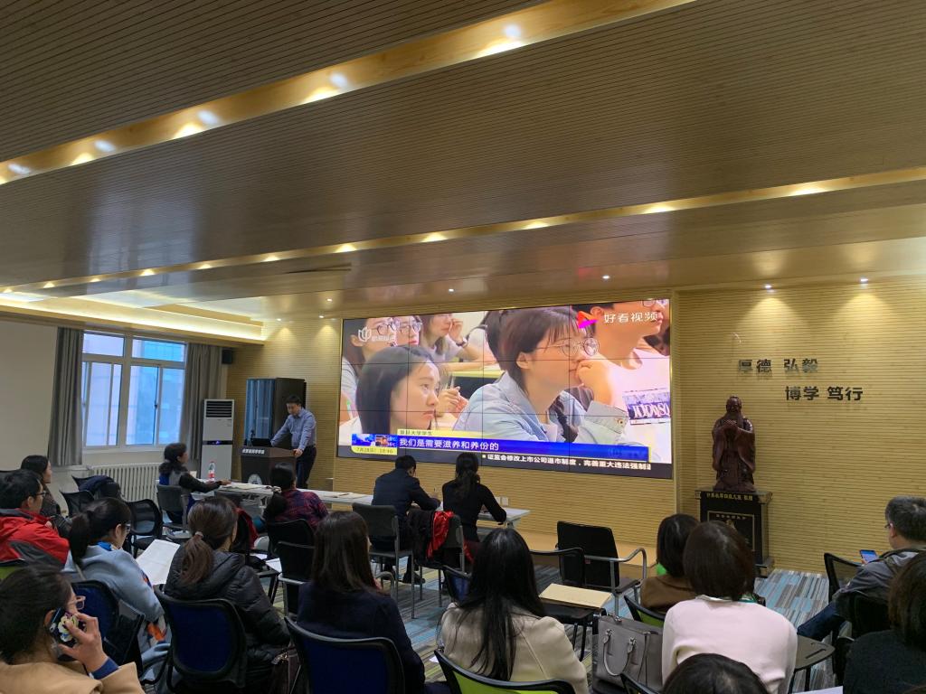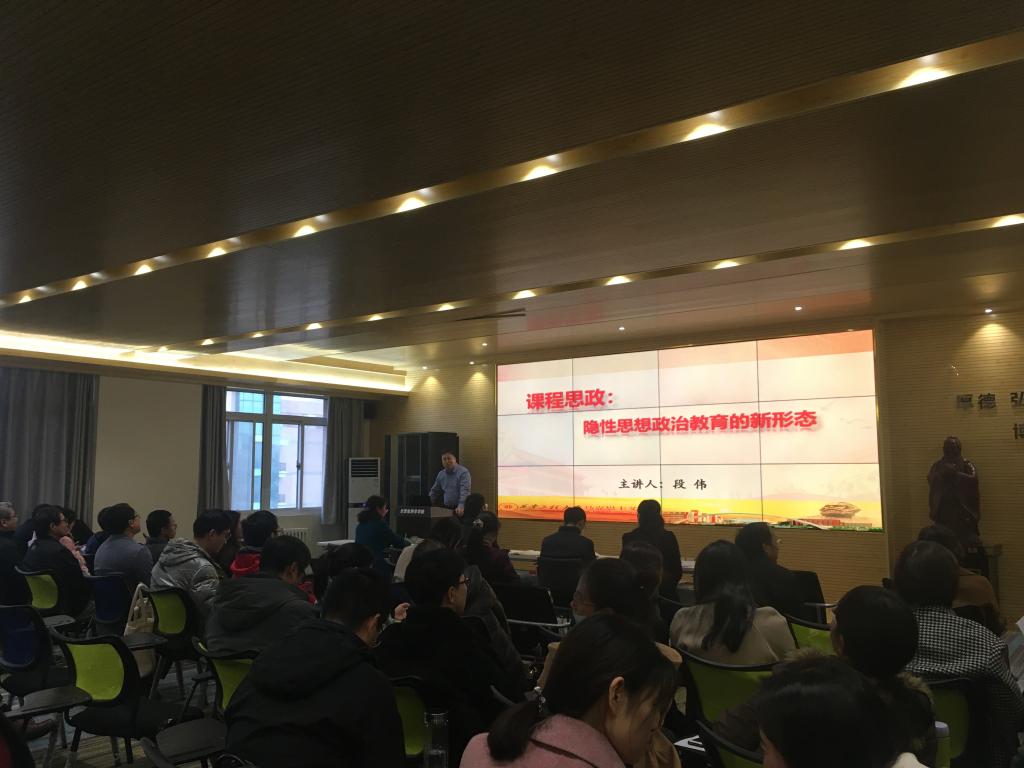 段伟老师以习近平总书记“要用好课堂教学这个主渠道,使各类课程与思想政治理论课同向同行,形成协同效应”的重要讲话为引,用风趣的语言、详尽的史实,深入浅出地分析了课程思政的相关概念及问题、“课程思政”的价值意蕴以及新时代“课程思政”的实施路径等内容。他提到,“课程思政”是大学生思想政治教育的渠道、载体和呈现方式,着力点在于以立德树人根本任务为导向,培养社会主义建设者和接班人,特别是强调弘扬社会主义核心价值观。“课程思政”的价值在于一方面会让教育回归初心,与“思政课程”同向同行,另一方面会让课堂更有温度,让课程更有深度。在如何开展“课程思政”这一问题上,段老师也提出了两点希望:一是希望全体教师能够提高育人意识,真正用实际行动去实现教书育人;二是大家要厘清“课程”+“思政”的设计思路,多采用画龙点睛式、专题嵌入式、元素化合式、隐性渗透式的融合手段。最后,大家还观看了《从思政课程到课程思政·把盐融进汤里的探索》视频,与会教师纷纷表示获益匪浅。