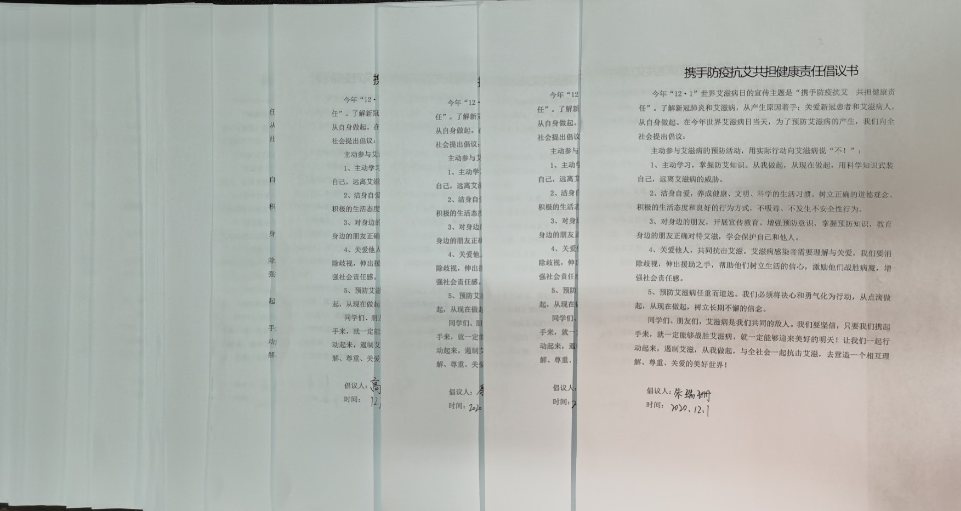 为了向更多同学传播抗疫防艾的正能量,全体师生还在“携手抗疫防艾共担健康责任”倡议书上进行了签名。(撰稿:左温慧  审核:周波)
