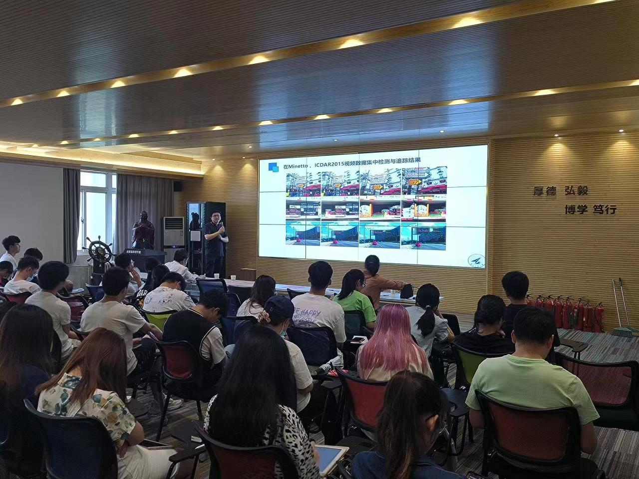 接着,王西汉以《自然场景下的文字检测及应用》为题,从自己的求学经历开始说起,详细介绍了自己研究方向的研究背景、关键问题、解决措施以及自己所做的项目经历。他向同学们介绍了自然场景下的文字检测中所遇到的问题有:文字任意方向的排序方式、文字语言种类的多样性、图片质量的增强等,其解决方式为基于由粗到细监督卷积网络的任意方向场景文字检测算法、基于尺度估计的自然场景中多语言文字检测算法、基于布局约束追踪的场景视频文字检测算法、基于反卷积网络消除图像中的模糊算法等。最后介绍了他的项目经历有863子课题、暗光照图像增强以及浑浊水下增强算法研究等。