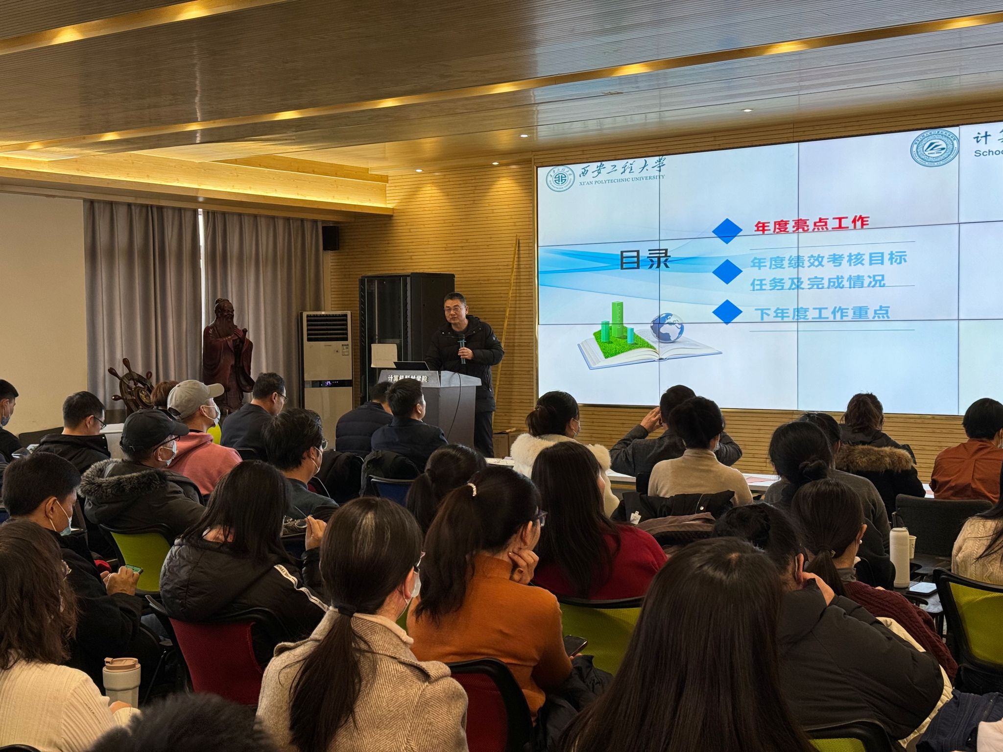 会上,院长薛涛以“责任担当 团结拼搏 高效实干 开拓创新”为主题做了学院2023年工作汇报。他从“亮点工作、年度绩效考核目标任务及完成情况、下年度工作重点”等三个方面,回顾了学院2023年度的主要工作和取得的成就,深刻分析学院发展面临的困难和挑战,指出了存在的问题和改进的措施,同时也对2024年度工作做了总体规划部署。薛涛要求全体教职工在2024年,齐心协力,攻坚克难,学院将下决心狠抓改革,破解学院发展难题,大力推动学院工作新年迈上新台阶。