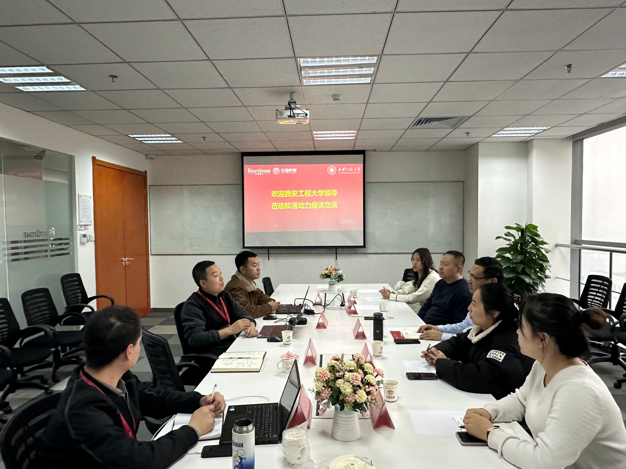 在西安软通动力技术服务有限公司,蔡鹏、赵勇进等与软通教育西北区域总经理郝少杰、软通动力西北区域招聘经理庄田等开展了深入交流。软通动力与计算机学院有多年合作关系,公司表示会积极考虑增加在学院的春招计划,建议学校在学生培养方面进一步与就业市场需求对接,高度重视学生实习实践环节培养,加强学生的职业规划、就业素养和价值观教育,提升毕业生就业竞争力。蔡鹏对公司长期以来对西安软件园人才工作的支持表示感谢,并提出了多项合作建议。赵勇进对公司提出的意见和建议表示衷心感谢,表示会就公司方面提出的涉及人才培养、教育教学、学科专业建设、生产实习、课程设置、学生就业等方面的意见和建议向学院和学校有关部门反映,希望保持和不断深化公司与学院的良好合作态势。