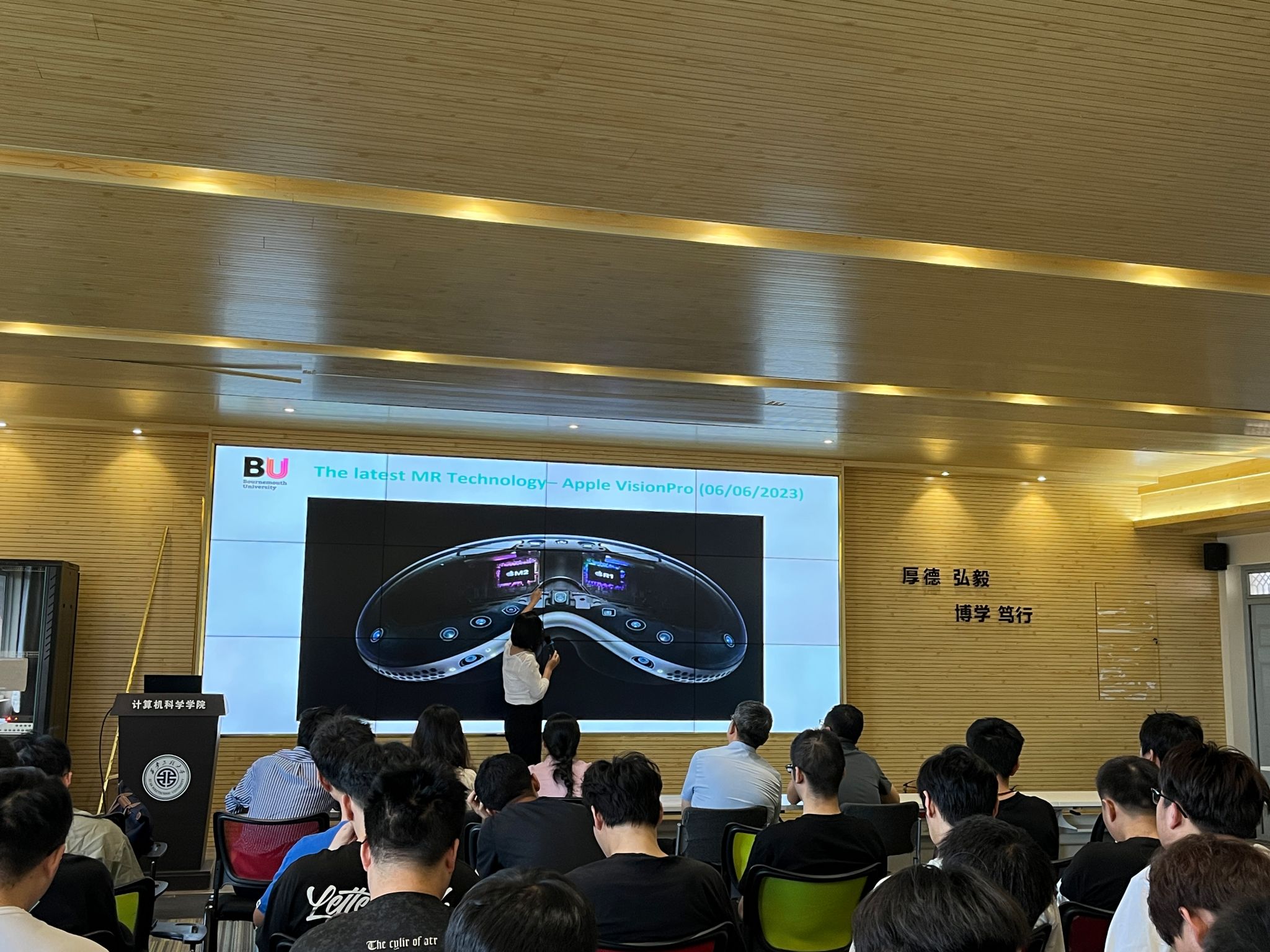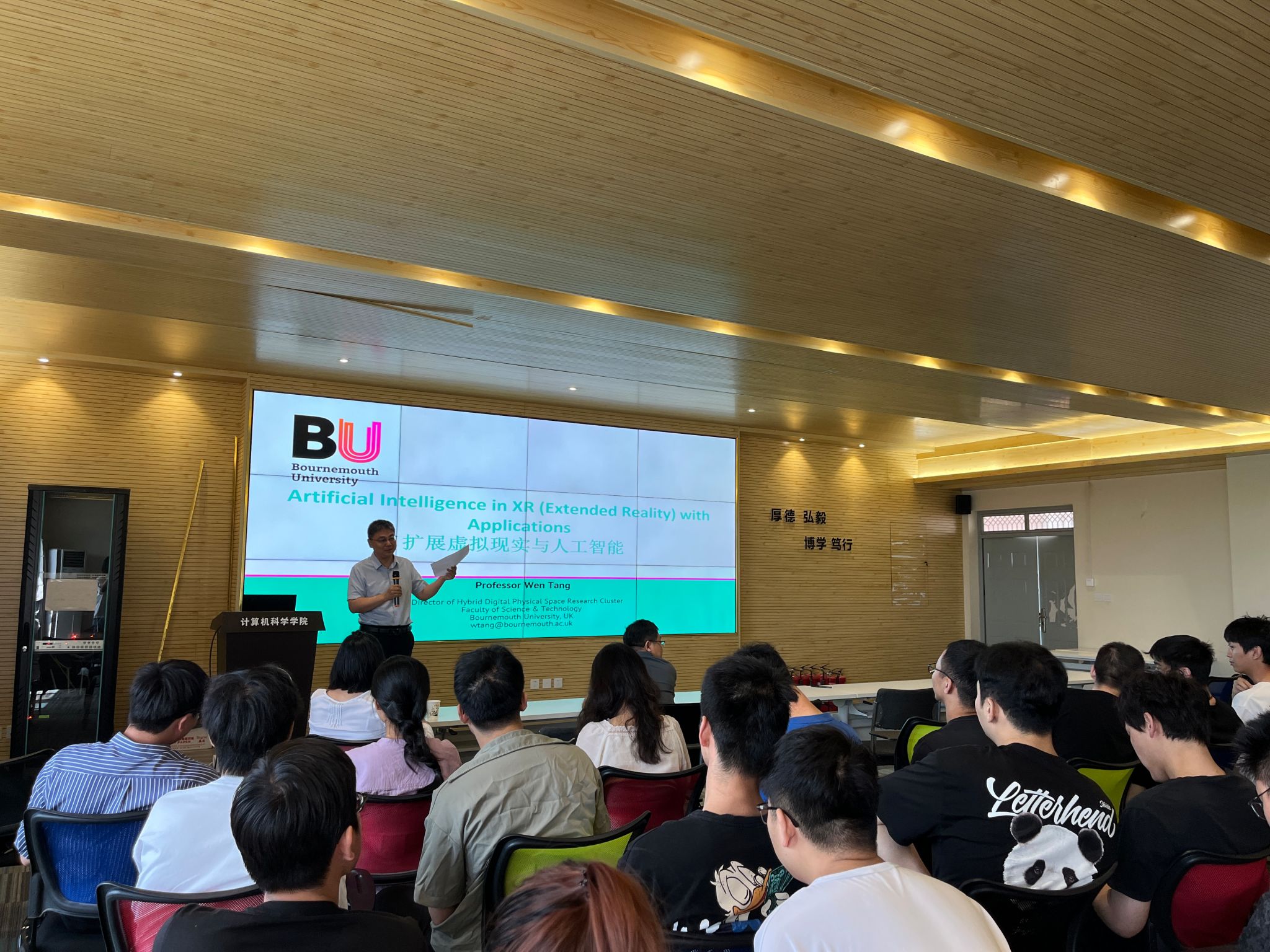 5月14日上午10:30,beat365在线唯一官网在笃行楼614报告厅举办第二十五期经纬学术沙龙,Bournemouth University(伯恩茅斯大学,英国)汤汶教授应邀做主题为“人工智能在扩展现实的应用(AI in XR with Applications)”学术报告。学院院长薛涛、副院长张凯兵、学院青年教师和研究生代表80余人参加了报告会。本次报告会由薛涛主持。
