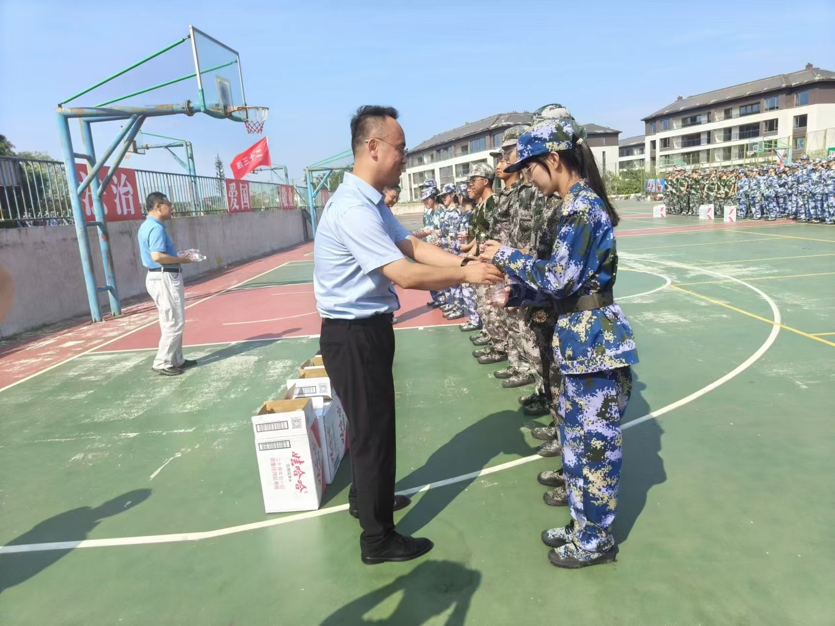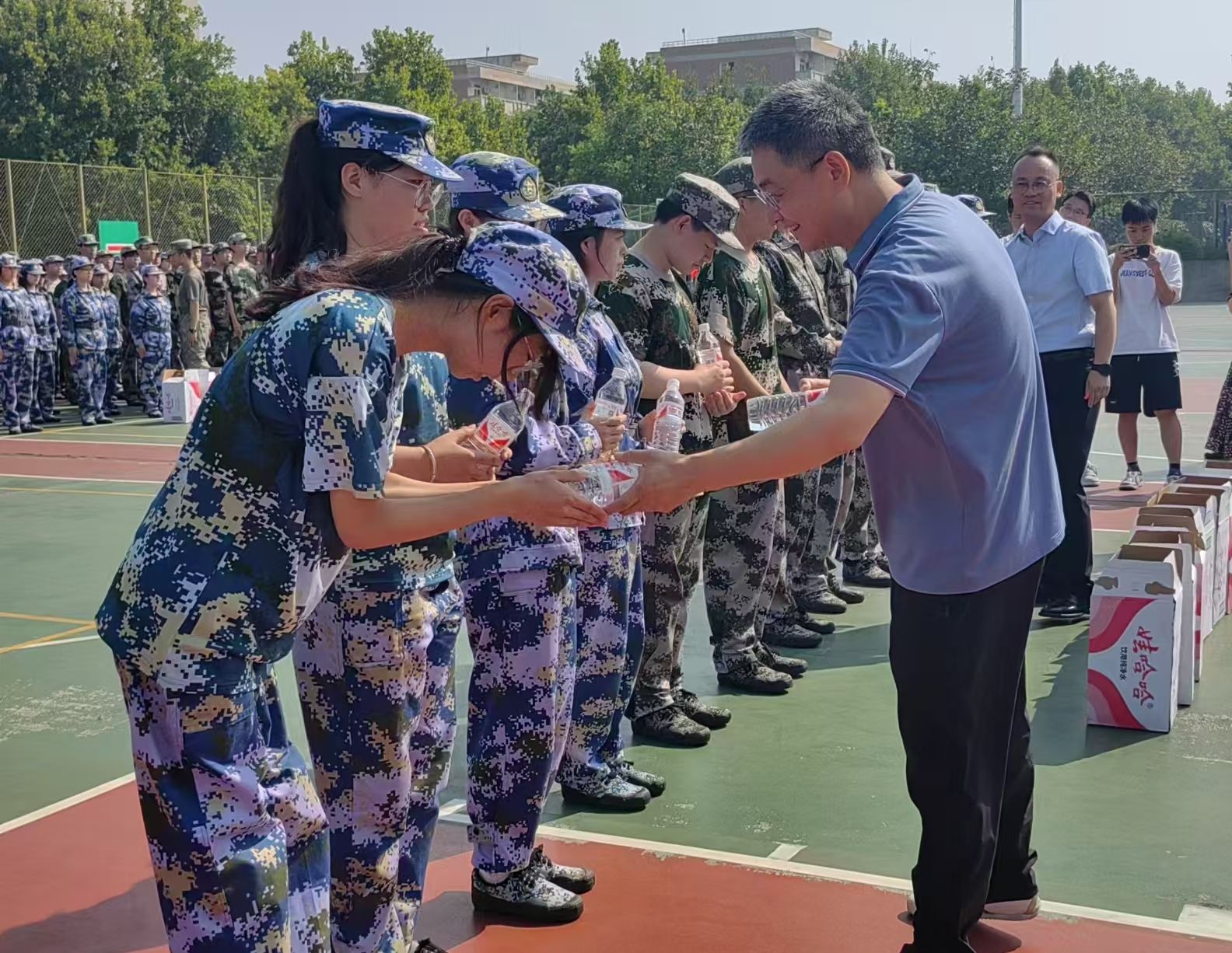 随后,学院领导老师为参训学生发放慰问物资,询问学生有什么诉求和困难,叮嘱带训辅导员实时关注新生军训、生活和健康状况,特别要做好伤病学生的关心关爱,对同学们遇到的问题要及时解决。强调在接下来的军训中要科学施训,密切关注同学们的身心健康,全力做好服务保障,确保顺利完成军训任务。