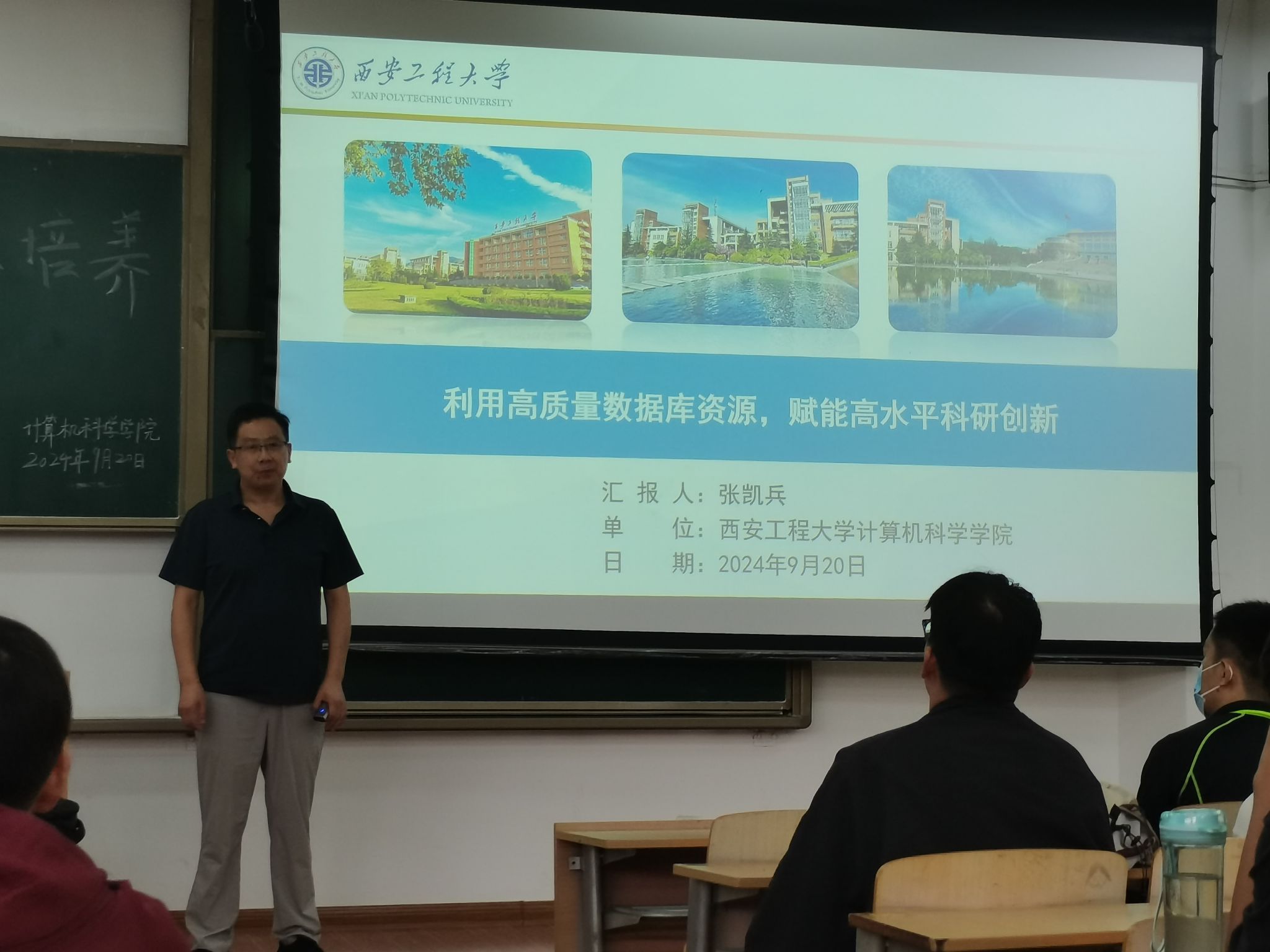 随后,张凯兵做了题为《利用高质量数据库资源,赋能高水平科研创新》的主题报告。报告从高质量学术资源的内涵分析、高水平创新成果的内涵分析、学术资源助力高质量论文写作和科研路上的几点建议四个方面深入剖析了高质量学术资源在研究生科研过程中的重要作用,讲解了如何有效利用这些资源助力高水平科研成果产出。他还分享了计算机科学前沿进展、发展趋势,为学生们提供了宝贵的专业科技前沿信息。在谈到课题组的研究情况时,他介绍了当前学院各课题组的组成情况、主要研究方向、取得的重要成果和未来改革发展的规划等。他鼓励学生们积极参与课题组的科研工作,通过科研实践来提升自己的科研能力,为将来升学就业做好内涵准备。