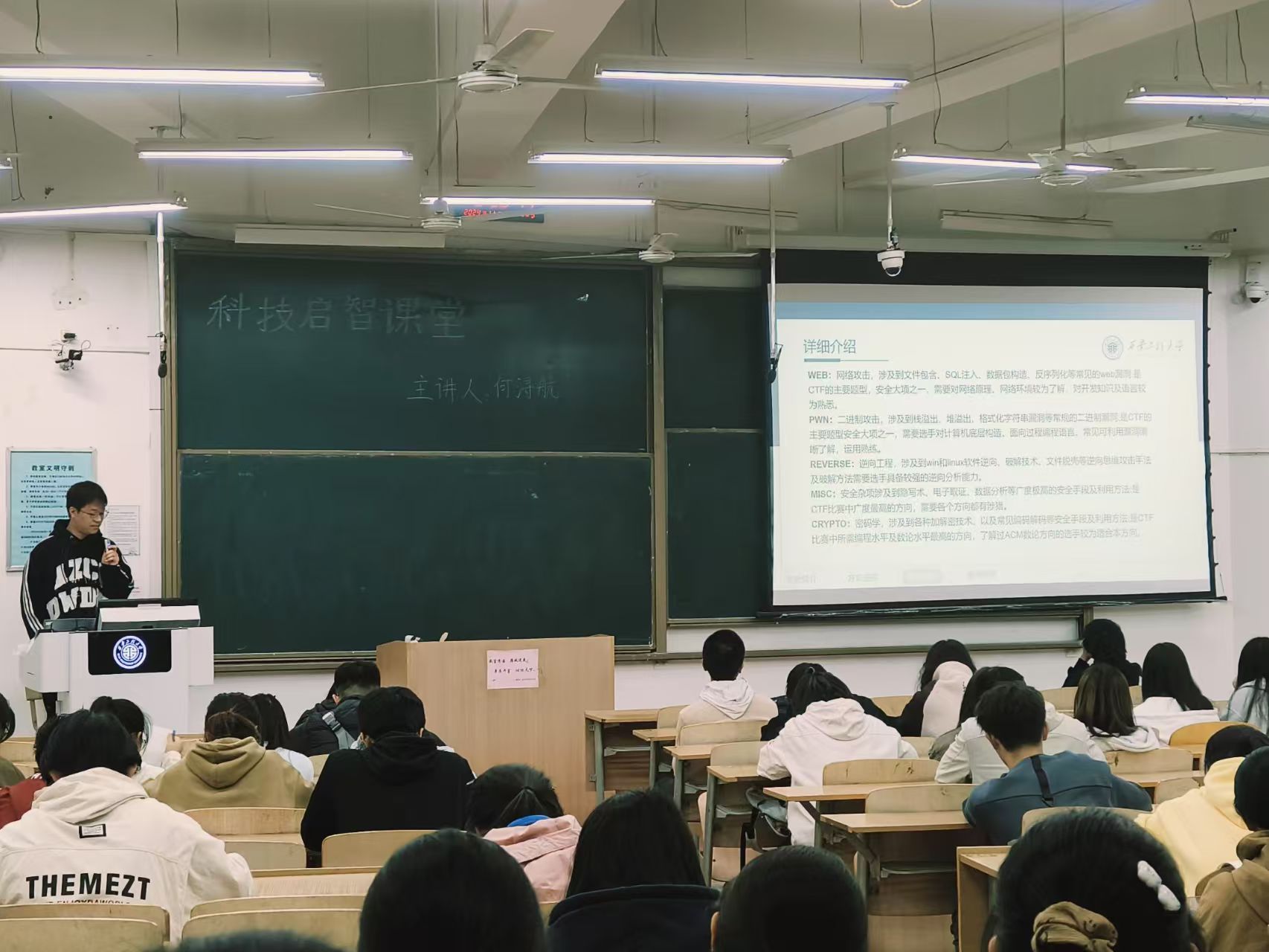 第一期科技启智课堂由计算机学院网络空间安全专业2021级何浔航同学主讲,主题为“Cyber Security扫盲”。他通过网络空间安全专业的性质、学科竞赛选择方向、竞赛内容、自学推荐等四个方面为同学们答疑解惑,用自己的亲身经历鼓励同学们积极参加竞赛,用比赛提升专业技能。