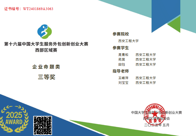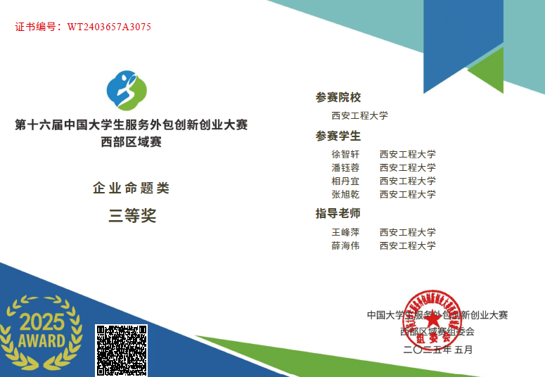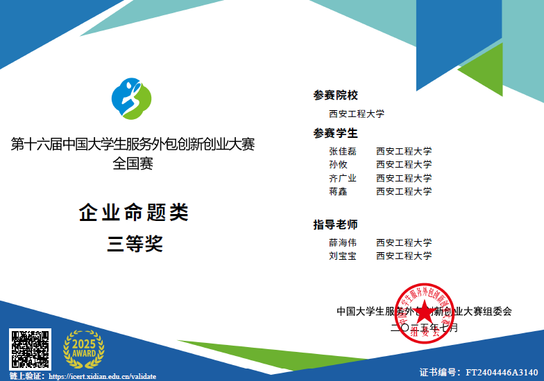 近日,第十六届中国大学生服务外包创新创业大赛圆满落幕。我院智能感知与多源信息融合创新团队指导的4支参赛队伍获国赛二等奖1项,三等奖1项,西部区域赛三等奖2项,其中由团队负责人刘宝宝副教授指导的本科生云星睿等同学组成的“数字未来”队伍,荣获西部区域赛1等奖并晋级全国赛,最终获得全国赛二等奖的优异成绩;由团队成员薛海伟博士指导的本科生张佳磊等同学组成的“AIris”队伍,获得西部区域赛二等奖并获全国赛三等奖的佳绩。由团队成员王峰萍博士指导的本科生晁青松等组成的“真相卫士”队伍与本科生徐智轩等组成的“Hope in despair” 队伍分别获得西部区域赛三等奖。