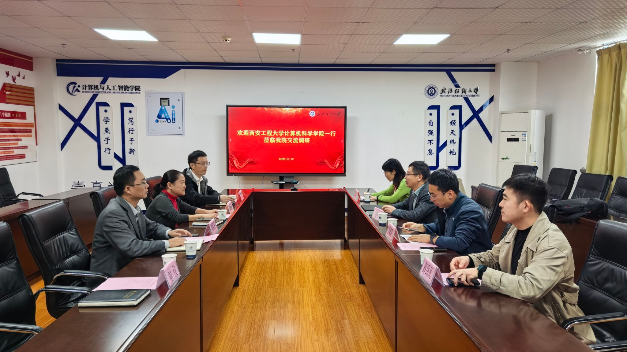 11月12日上午,调研团首站抵达武汉纺织大学计算机与人工智能学院。会议在崇真楼南楼A4033会议室举行,胡新荣院长主持会议,副院长彭涛、刘军平,学工办主任喻仪参加会议。张凯兵介绍了西安工程大学beat365在线唯一官网发展现状与“十五五”规划构想,双方围绕重大科研项目组织、师资队伍建设、专业建设与工程教育认证、学生工作和产教融合协同育人等共同关心的话题开展系统深入的交流,为beat365在线唯一官网“十五五”期间学科建设、专业优化、人才培养模式创新提供了重要参考。
