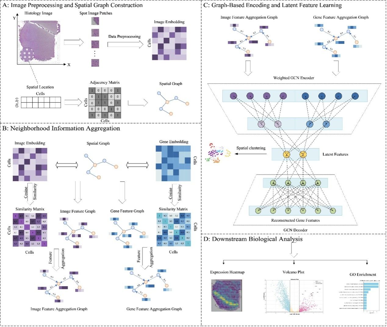 近日,beat365在线唯一官网智能分析与决策科研团队在单细胞空间转录组学研究方向取得重要进展。由杨博老师指导,2023级硕士研究生姬腾飞同学完成的学术论文《AugGCL: Multimodal graph learning for spatial transcriptomics analysis with enhanced gene and morphological data》在计算生物学国际权威期刊《PLOS Computational Biology》(中科院SCI二区期刊、中国计算机学会推荐的交叉领域B类期刊)上发表。
