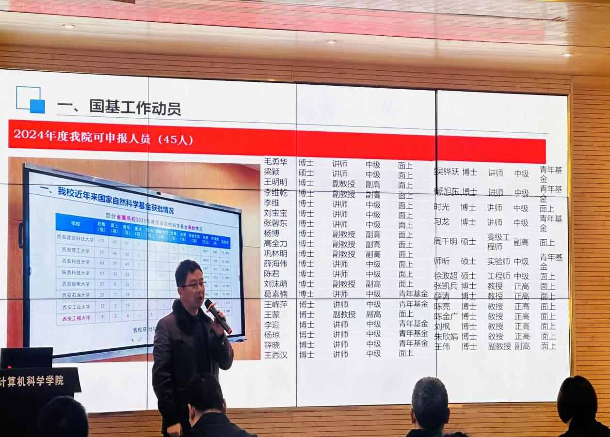 张凯兵副院长介绍了我院2023年项目立项情况,分析了2023年国家自然科学基金申报工作中存在的问题和不足,建议老师们要精准发力、积极推进,希望大家能够共同努力,在国家自然科学基金申报上取得新的突破。最后,张凯兵对2024年国家自然科学基金申报工作做出具体安排,对各时间节点和阶段目标要求作了重点强调。(撰稿:贺姗 审核:赵雪曼、张凯兵)