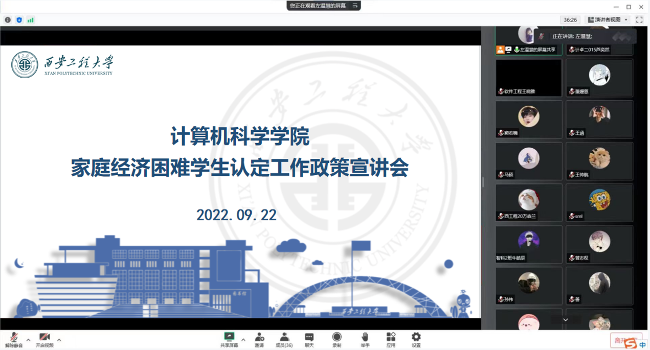 本次宣讲首先帮助全体学生进一步了解资助,理解政策。左温慧带领大家集中学习了《西安工程大学家庭经济困难学生认定工作实施办法》,重点解读国家资助政策对家庭经济困难学生的重大意义、困难生认定政策,以进一步强化学生对于资助政策的理解,便于具体资助工作的开展。