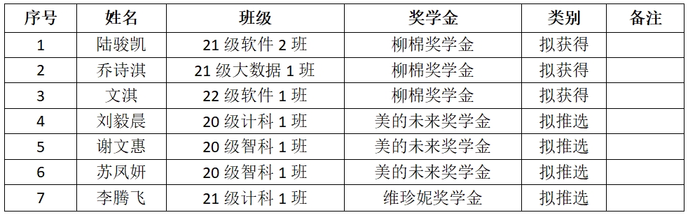 按照学校《关于开展2022-2023学年国家助学金及社会专项助学金评审工作的通知》要求,经学生本人申请、各年级推荐小组推荐、学院学生资助工作领导小组审核认定,本年度我院共推选3人拟获柳棉奖学金,拟推选3人参评美的未来奖学金、1人参评维珍妮奖学金。现对评审结果予以公示(附详细名单):
