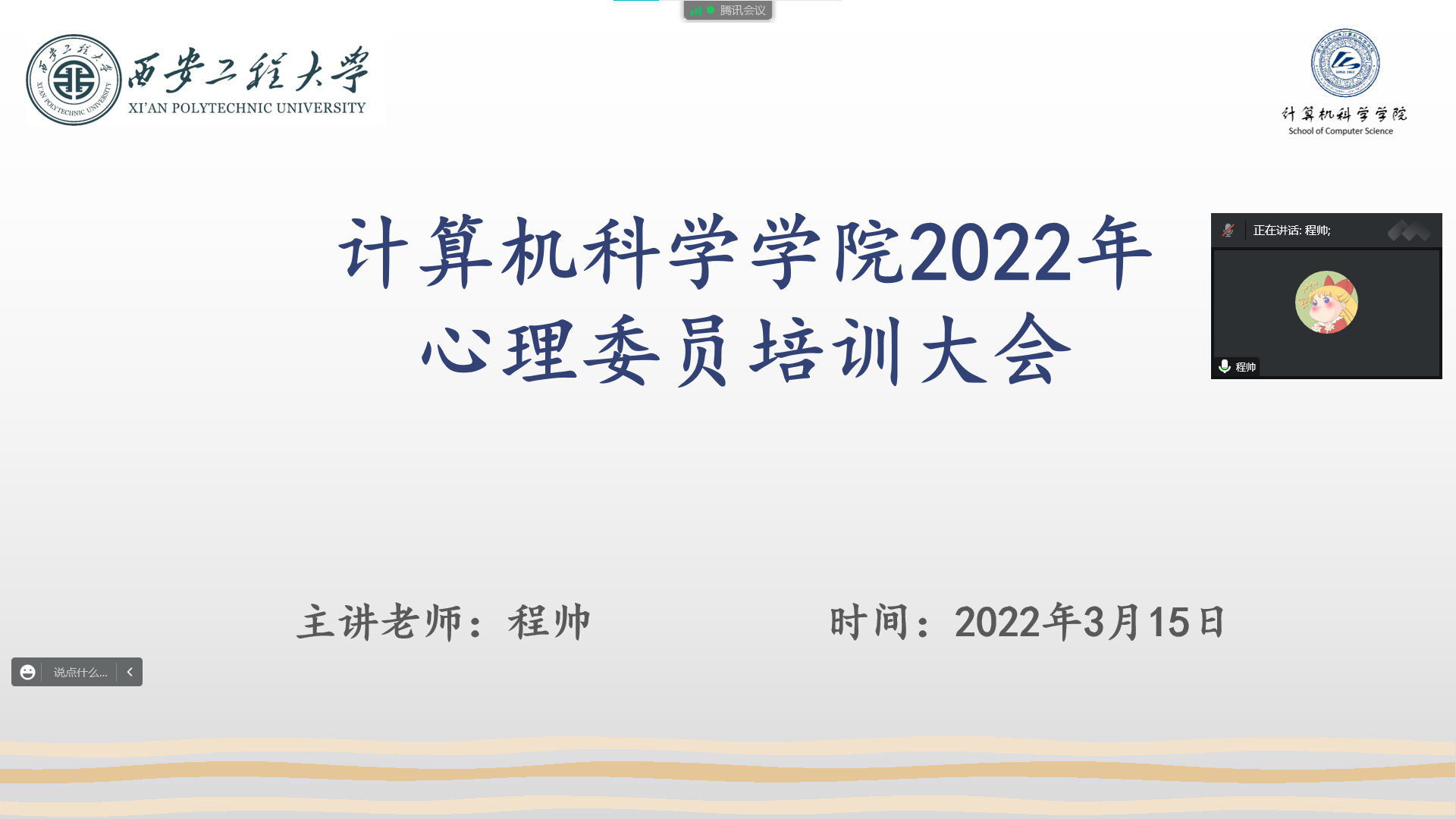 为促进我院学生增强心理健康意识,形成健康的心理和健全的人格,同时促进学校与社会的和谐稳定,构建现代和谐校园与和谐社会。在接到我校心理健康教育季活动的相关通知以后,我院特于2022年3月15日开展对各班心理委员的线上培训工作,旨在增强学生的心理健康意识,同时还可以营造学院良好的心理健康教育氛围。