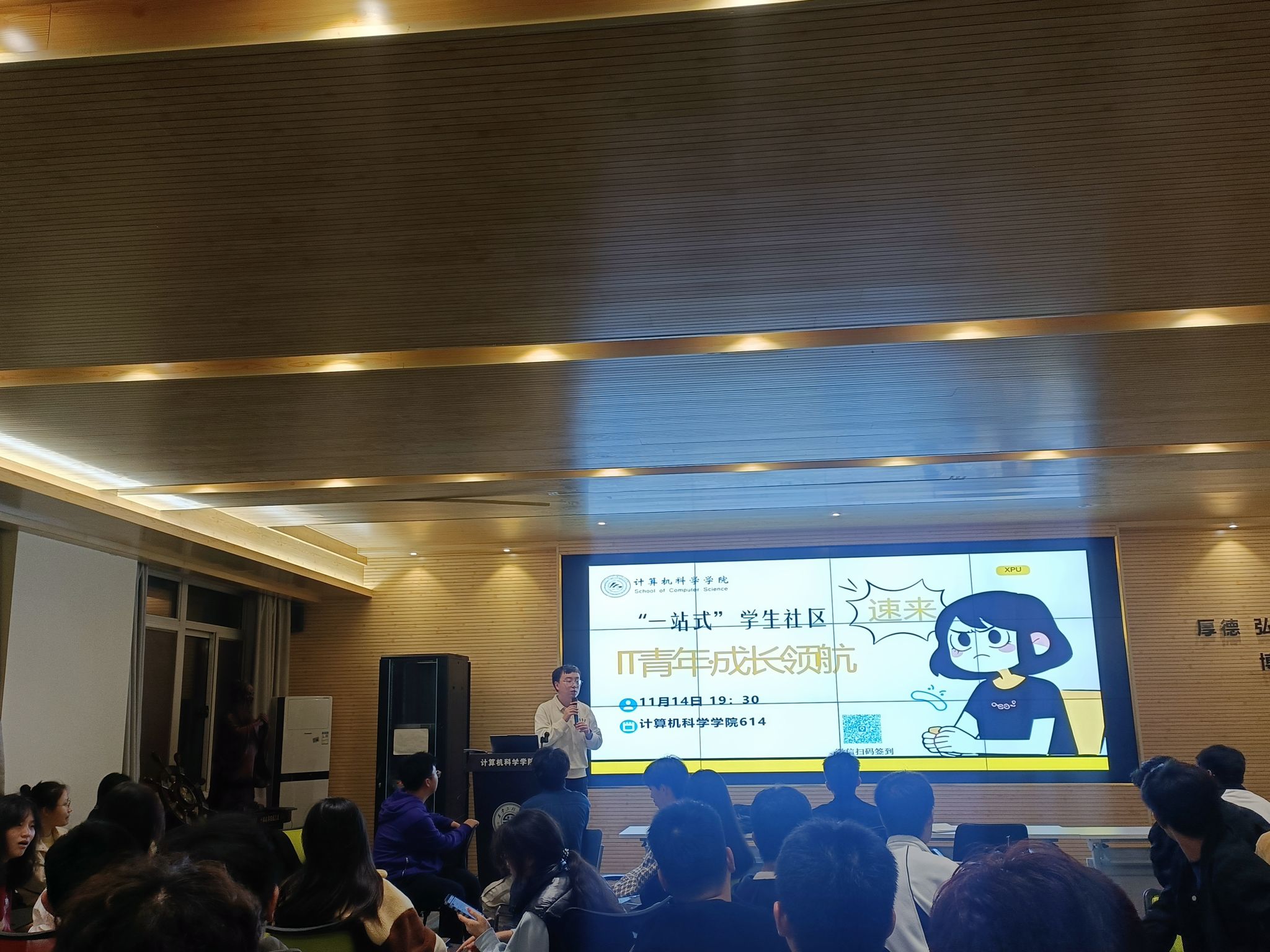 第一期活动于11月14日在临潼校区笃行楼614报告厅举行,2021级计算机科学与技术卓越班叶顾玮豪、王可、李欣雨、彭美玲和谢雨荷同学受邀到现场做经验分享,2024级计算机科学与技术(卓越班)全体同学参加活动。