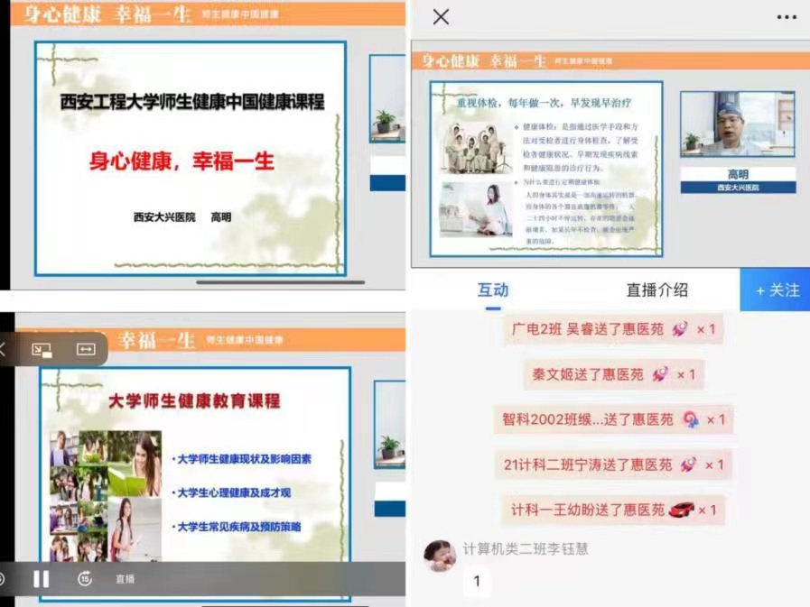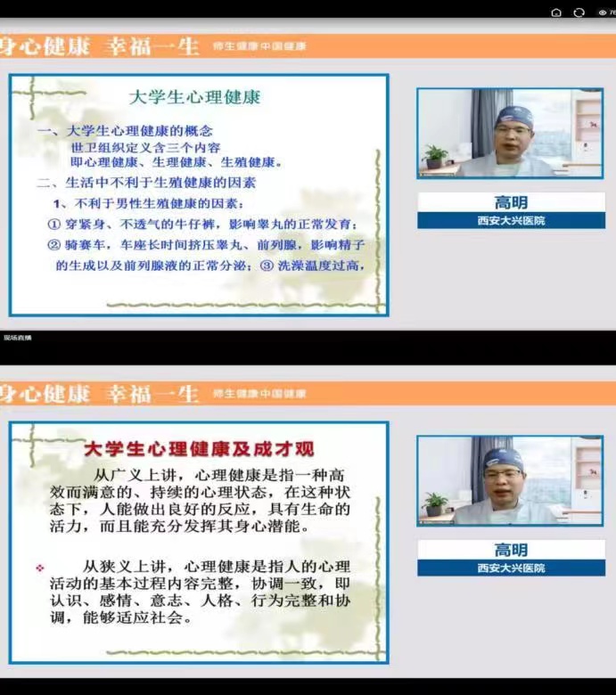 本次讲座以线上形式进行,讲座包括健康的生活方式、新冠肺炎预防、人体常见疾病的处理和预防等三个方面内容。高明主任讲授了大学生健康现状及影响因素、大学生心理健康常见的问题及如何应对,从医者的角度提醒青年学子要培养良好的生活方式,掌握最基本的安全防护和自我保健知识。对于成长和成才观,高明分享了自己的科技成才之路,建议学子们要正确认识自己,认识自己的生理特点、心理特点,认识自己的优势、劣势,知道“我能做什么,我要做什么”。告诉广大学子生涯规划重在行动,成功源于有效的时间管理,成功关键在于努力学习本领和师长的教育支持;结合当前疫情防控形势,高明对新冠肺炎病毒的来源、传播途径以及在日常生活中如何做好防护等进行了详细的讲解和说明。结合自己的临床专业知识,还为师生讲解了常见泌尿生殖相关疾病的诊治,并对艾滋病的传播、预防和治疗进行了宣讲。高明主任的讲座深入浅出,语言生动诙谐,激发了广大师生和家长的关注和兴趣,大家认真倾听,积极互动,师生就新冠疫情防护、心理问题、常见病治疗等热点问题积极提问,高明主任一一进行了解答说明,整个讲座过程气氛热烈,秩序井然,师生们在轻松愉快的气氛中接受了健康知识的普及教育。